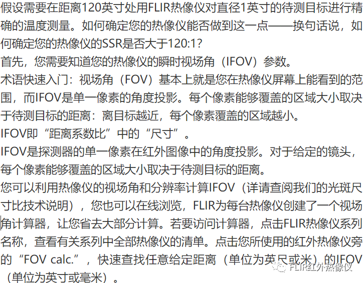 我們得到的距離系數比為120:0.31。簡而言之,0.31英寸大約為1英寸的1/3,因此該計算結果得出的結論就是:該熱像儀能夠在120英寸遠的距離測量1/3英寸的物體。