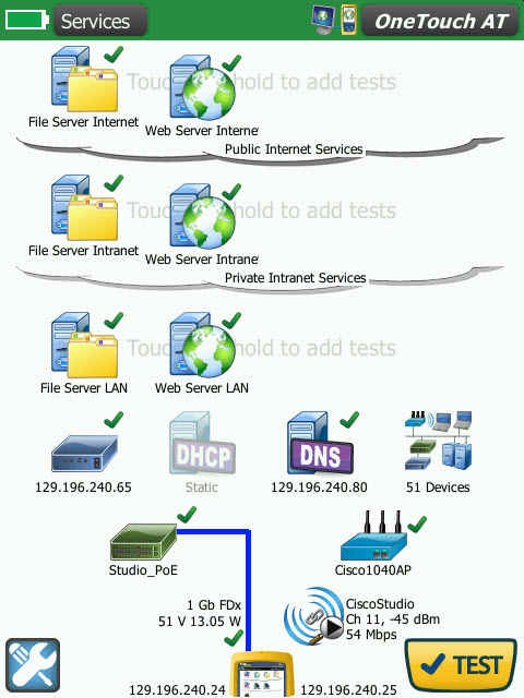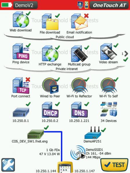 使用一鍵式 AutoTest 自動測試配置文件中定義的所有事項。AutoTest 測試從物理層開始,經過有線和無線基礎設施,直到網絡服務和用戶定義應用程序測試。清晰的通過/失敗和警告指示器可突出顯示潛在問題。最高級的通過/失敗標識可提供一目了然的整體狀態(tài)。