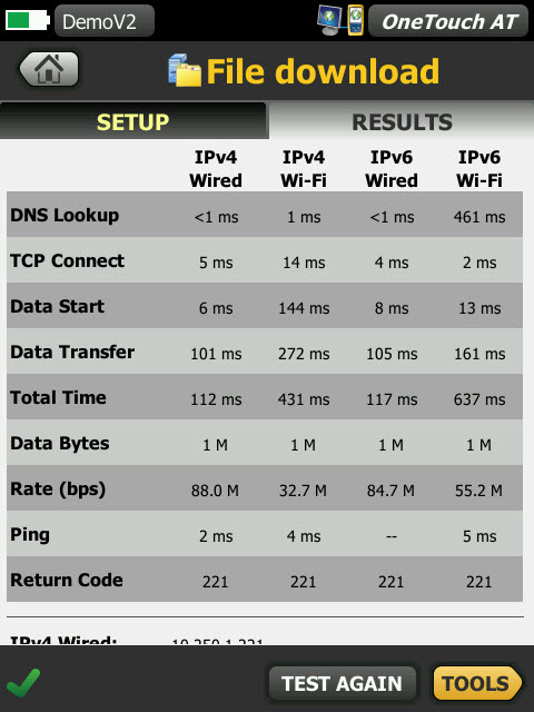 測試結果同時顯示,以輕松進行有線/Wi-Fi 和 IPv4/IPv6 性能對比。以下為幾個示例:ping(拼接)您的 WLAN 控制器,連接至 VoIP 呼叫管理器上的端口 2000,下載具有 Web 界面的應用程序頁面,從服務器上傳或下載文件,訂閱多播組,訪問點播流媒體視頻服務器中的視頻內容,或者向您的手機發(fā)送文本消息電子郵件。