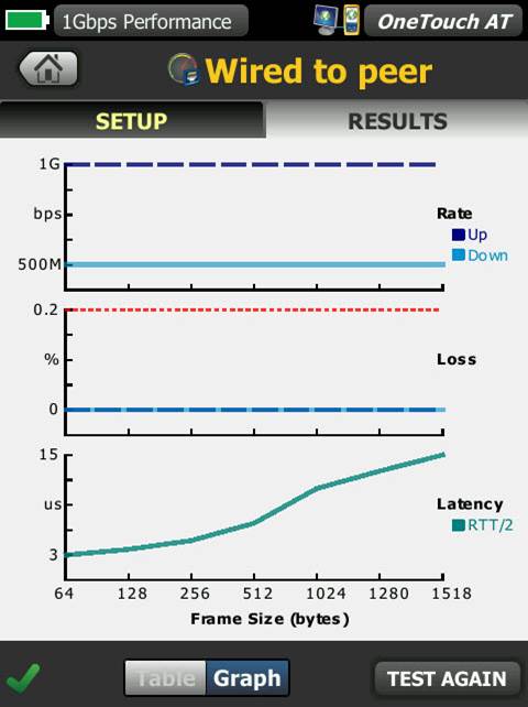 通過端對端的路徑性能評估,確保新安裝或升級的有線和 Wi-Fi 網絡達到 SLA 目標,并且能夠滿足新的更高帶寬的應用程序的需要。評估本地 OneTouch AT 和遠端 OneTouch AT 對等設備或遠端 LinkRunner 反射器間的吞吐量、丟幀、延遲和抖動。遠端對等設備提供上行和下行的結果,而遠端反射器提供往返的結果。在銅線和光纖網絡上評估速率達到 1 Gbps 時的性能,在 Wi-Fi 網絡上評估速率達到 600 Mbps 時的性能。特殊用途型號的存在幫助實現了同一設備上的 OneTouch AT 有線接口與 Wi-Fi 接口間的測試,無需遠端設備。