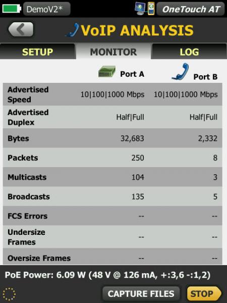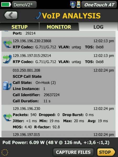 在線實現 IP 電話和網絡之間的 OneTouch AT 連接,進行實時故障排除和分析。VoIP 分析測試揭示了 PoE、DHCP、TFTP、SIP 和 SCCP 的相關問題。該測試可以了解未加密的 SIP 和SCCP 流量,以調試 VoIP 電話問題,并量化 VoIP 呼叫質量。可以選擇同時捕獲 VoIP 會話。