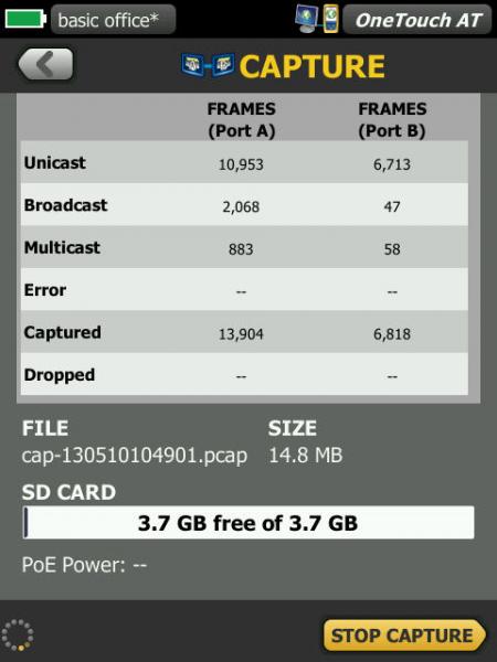 在需要使用數據包層級的視圖解決復雜的網絡或應用程序問題時捕獲有線、Wi-Fi、VoIP 和自動測試流量。通過過濾流量捕獲最重要的部分。將捕獲文件導出到計算機中,以便用協(xié)議分析軟件進行解碼和分析。捕獲單端口、兩個端口集合或客戶端設備和網絡間的在線端口的有線流量。在線捕獲避免配置交換機鏡像端口或安裝單獨的分路器的復雜性、所需的時間和成本。通過信道和模式捕獲 Wi-Fi 流量(20 MHz 或 40 MHz+)。
